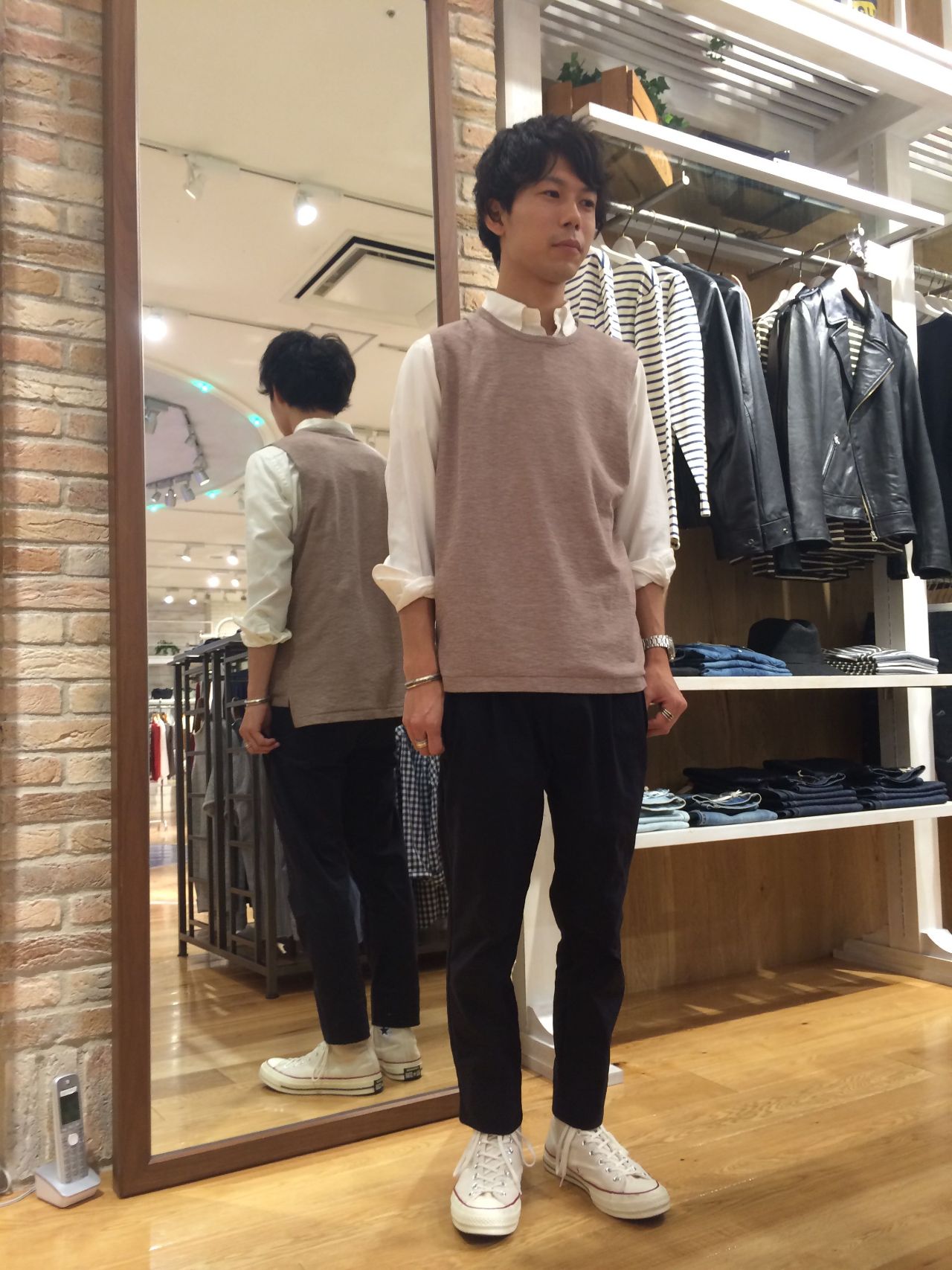 先ほどもご紹介した通り、こちらのベストは生地感が薄めな物ですので、上からジャケットやライトアウターもストレスなく着て頂けます。