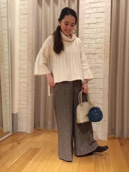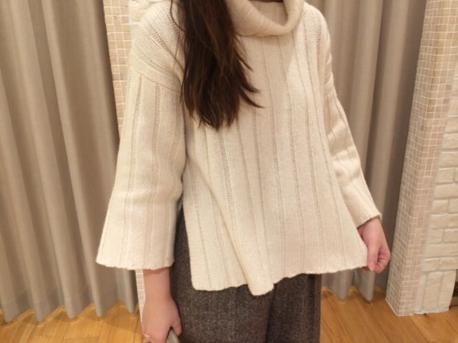 タートルネックのゆったりしたシルエットのニットに、ワイドパンツを合わせた今年らしい抜け感のあるコーディネートです。