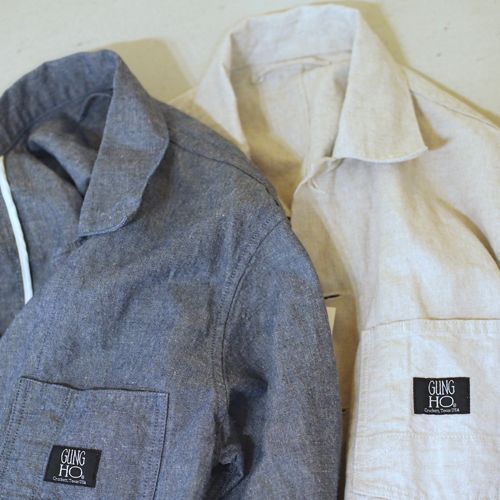 #01_GUNG HO のワークベースを継承しつつ、清潔感と凹凸感を兼ね備えたフレンチリネンダンガリーのショップコート。