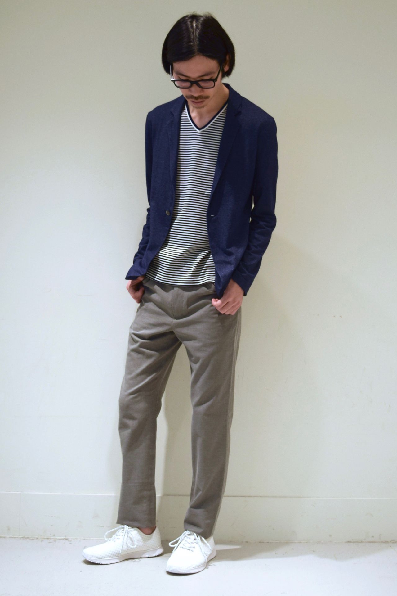 同生地のジャケットもあり、セットアップで合わせてビジネスシーンが基本。休日にTシャツ×ジャケットでカジュアルもおすすめ。
