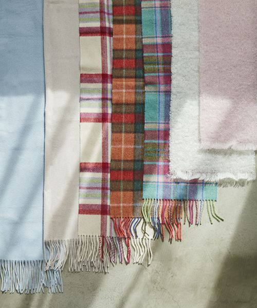ふわふわしたモヘア素材や、肌さわりが病みつきになる、カシミア100%の大判ストールは、優しいパステルカラーを選んで冬のスタイルのポイントに。