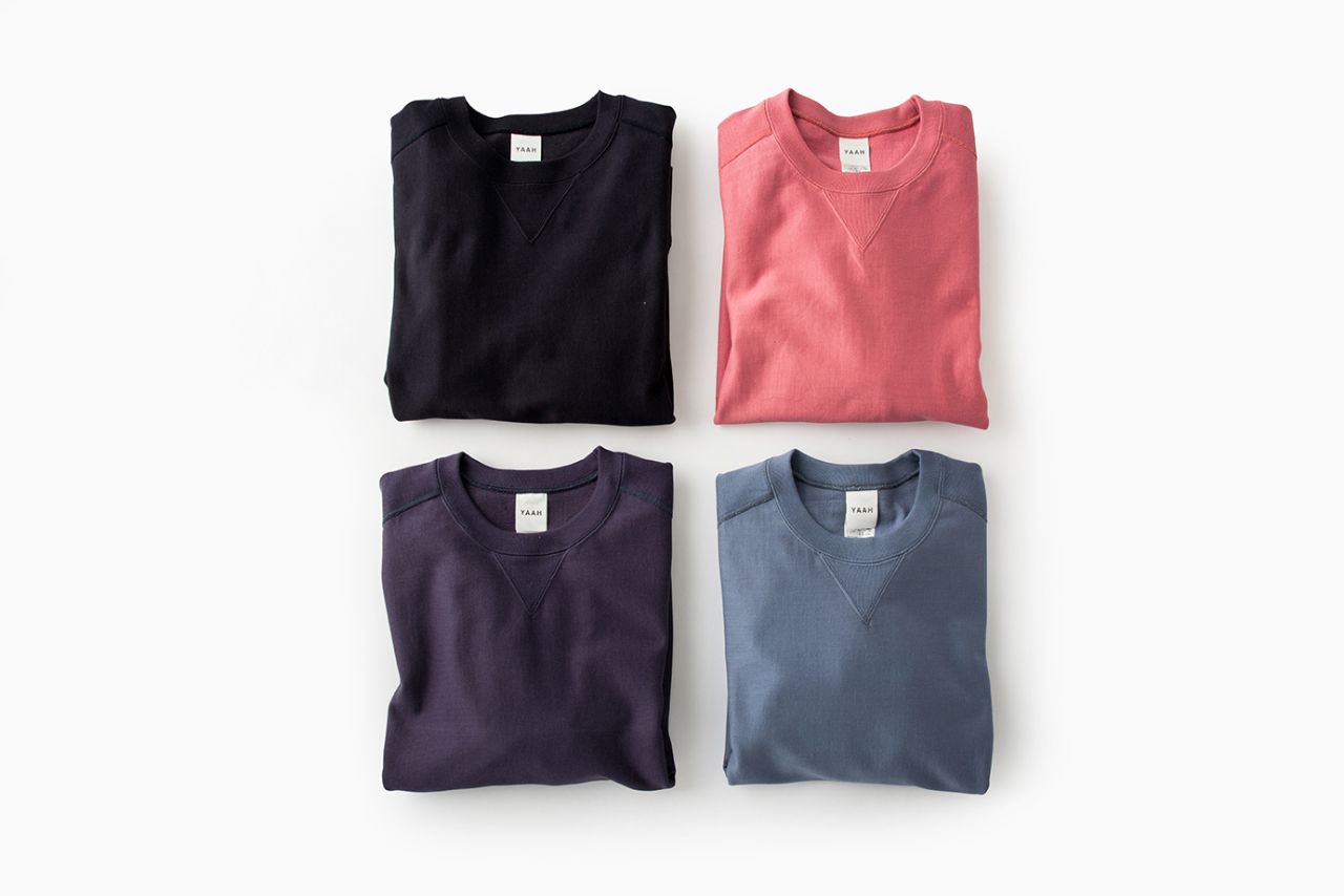 上記の糸を使用しているため重量感があり、カジュアルながらも上質な裏毛に編まれています。また、付属のフライスも裏毛の表と同様の糸を引き揃えて編み立てています。着れば着るほどよい風合いになっていきます。