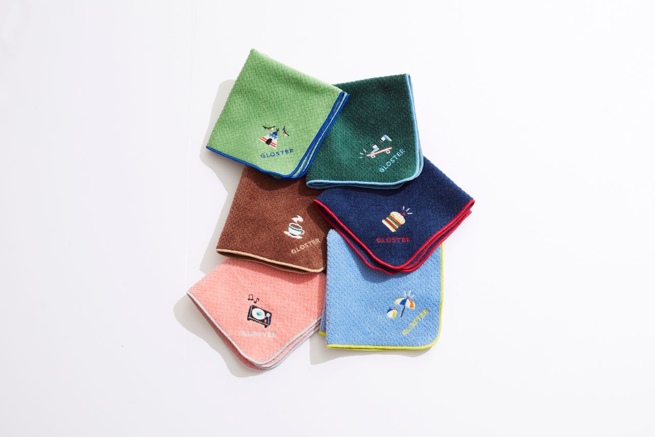 カラーごとにワンポイント刺繍が異なるタオルハンカチ。