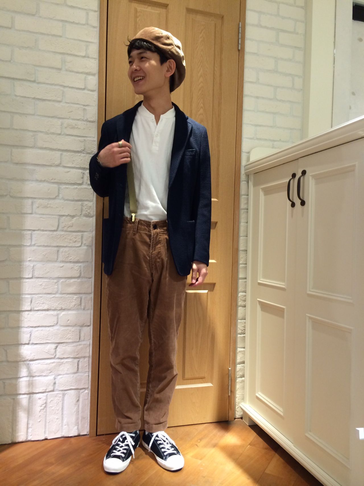 こってりなアイテムと色使いの中に、さらっと紺ブレとコンバース?を取り入れ