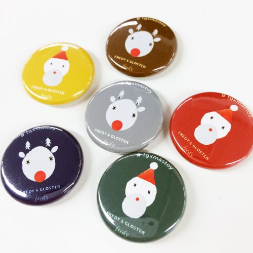 赤鼻のルドルフと、サンタクロースのイラストの入った可愛い缶バッジ。見ているだけでなんだか気分もほっこり。