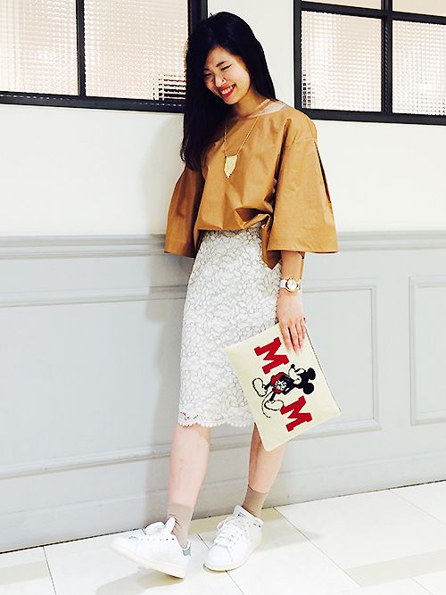 スニーカーやキャラクターアイテムでオトナかわいいスタイルに。