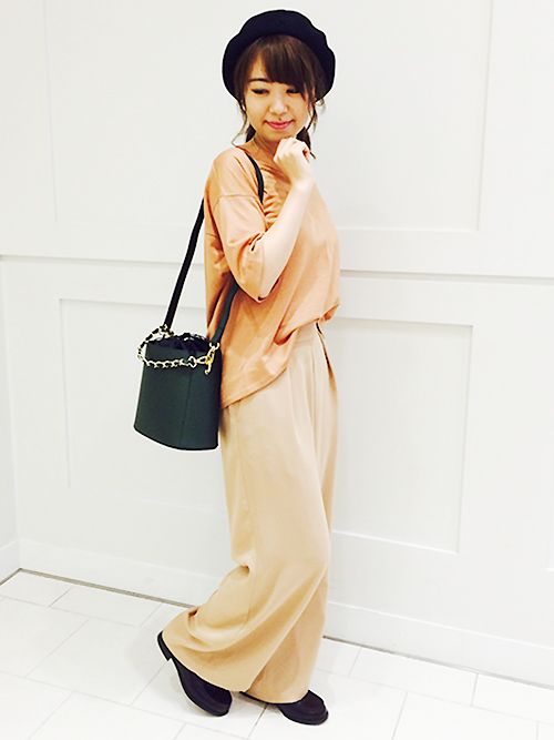同系色のワイドパンツと合わせたトレンドコーデ。