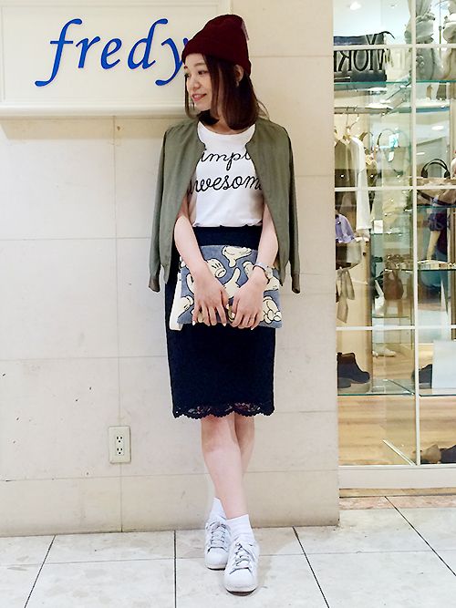大人っぽいレースのタイトスカートをTシャツやスニーカーで