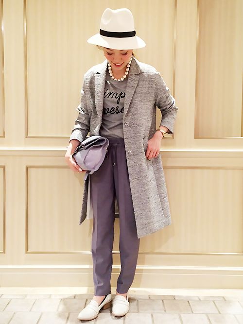 こちらも同じテーラーコートをフェミニンスタイルに。