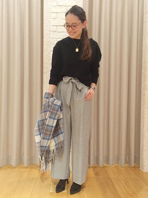 マニッシュな印象のワイドパンツ、この時期らしいモノトーンで