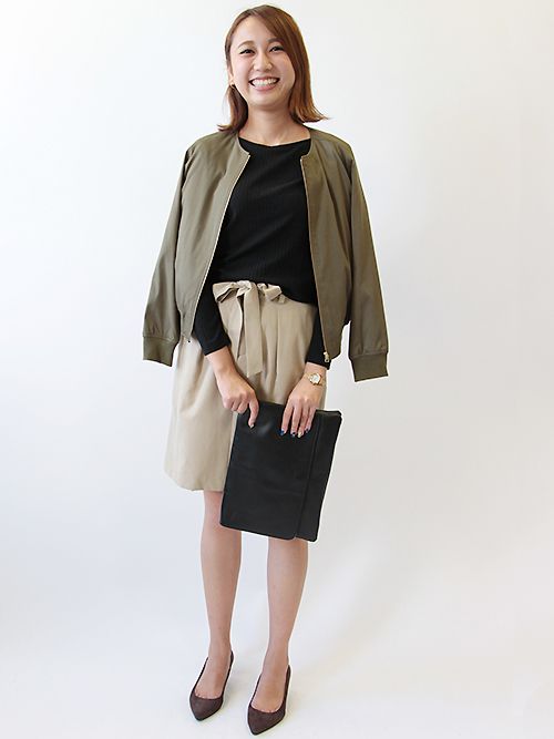 ミリタリーカラーのブルゾンを女性らしくコーディネート。