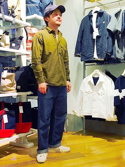 こちらも今シーズンおすすめのカーキのシャツを使ったシンプルコーデ。