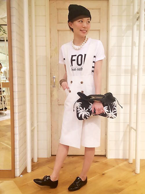 今回はモノトーンでストリート風にアレンジ、ブラックの小物が効いています。