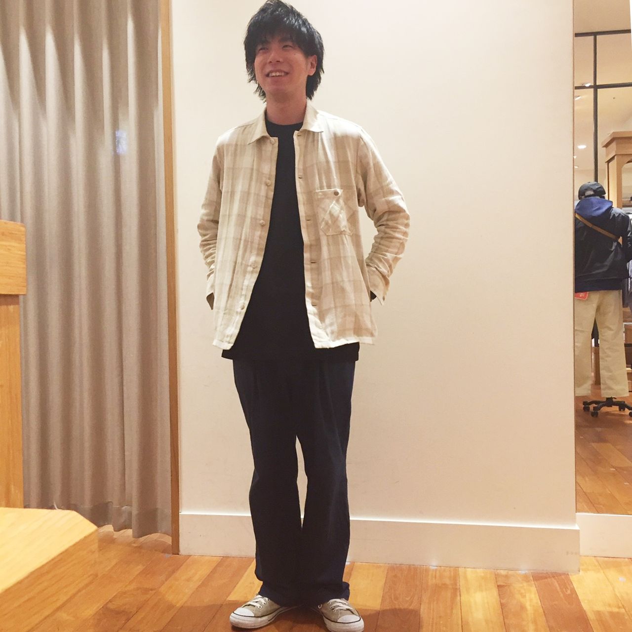 色数を絞り、チェックを引き立てたシックなコーディネートです。