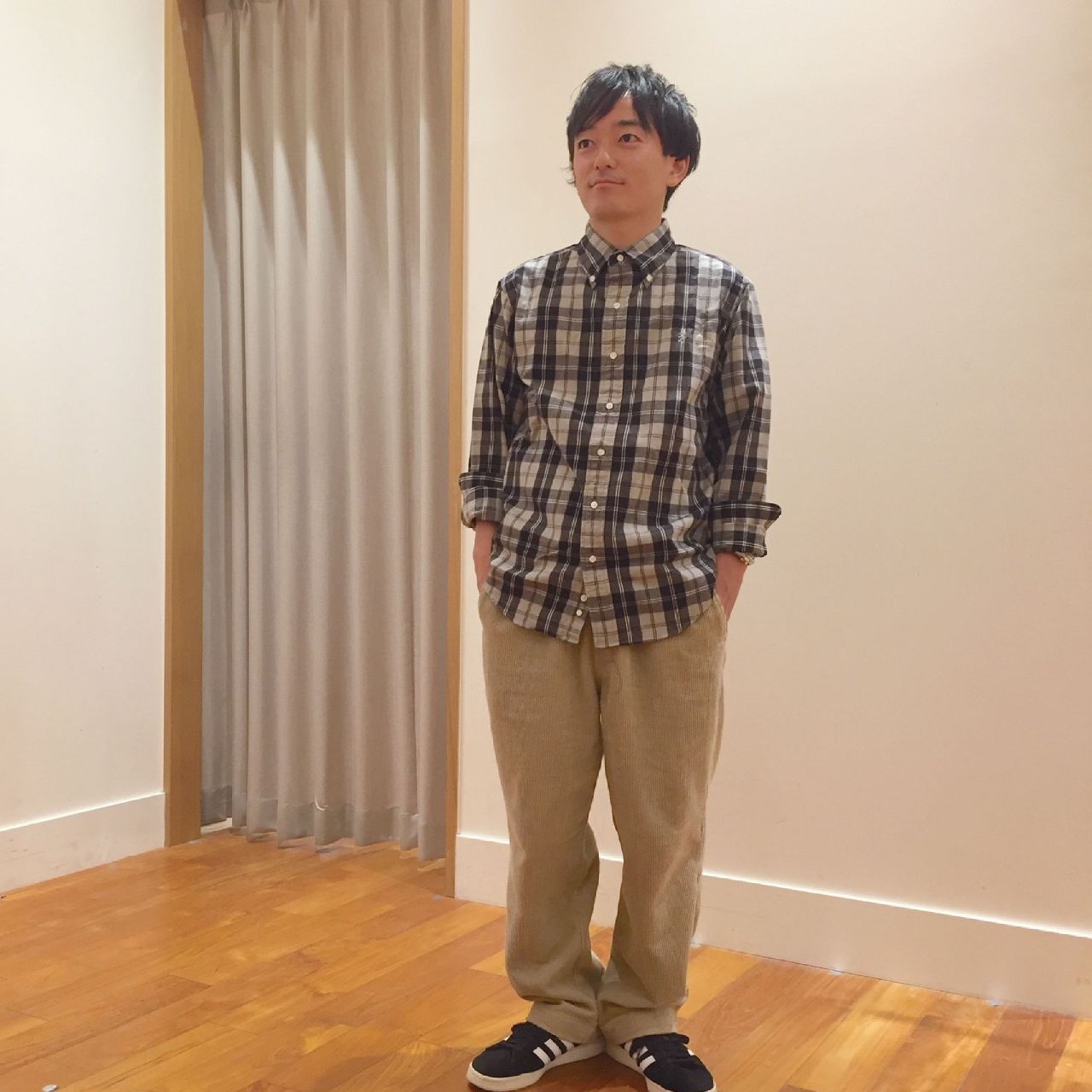シックな配色のチェックシャツはGymphlexのアイテムです。