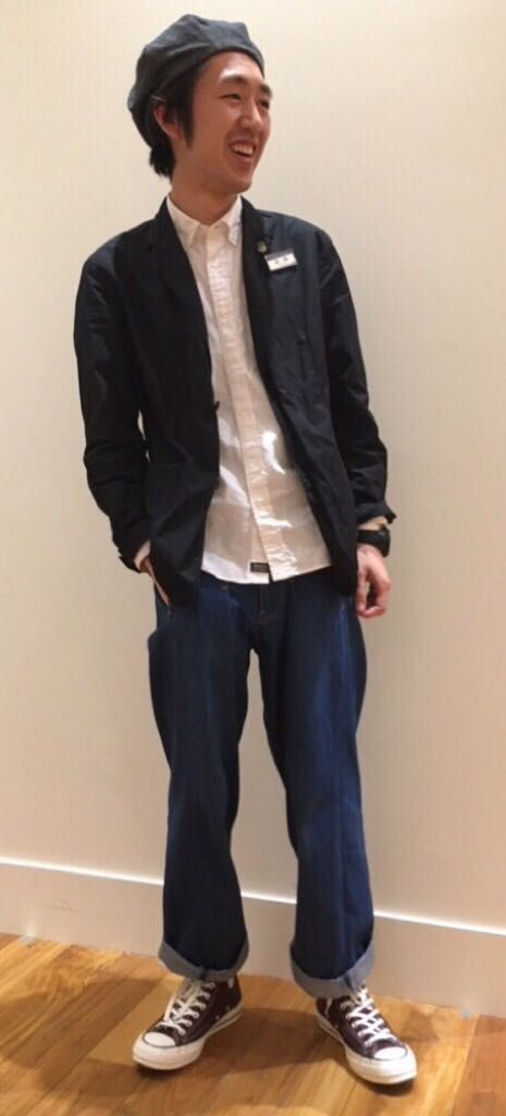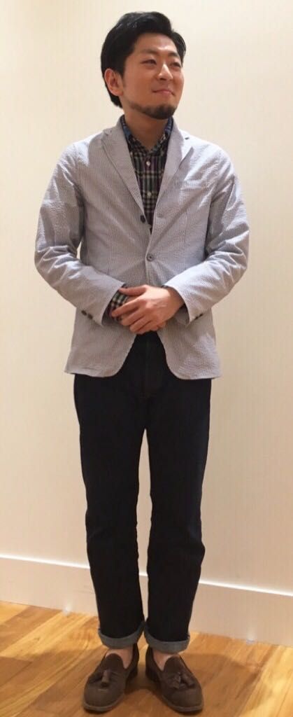 奇しくも私と同じジャケット、シャツ、デニムのコーディネート。