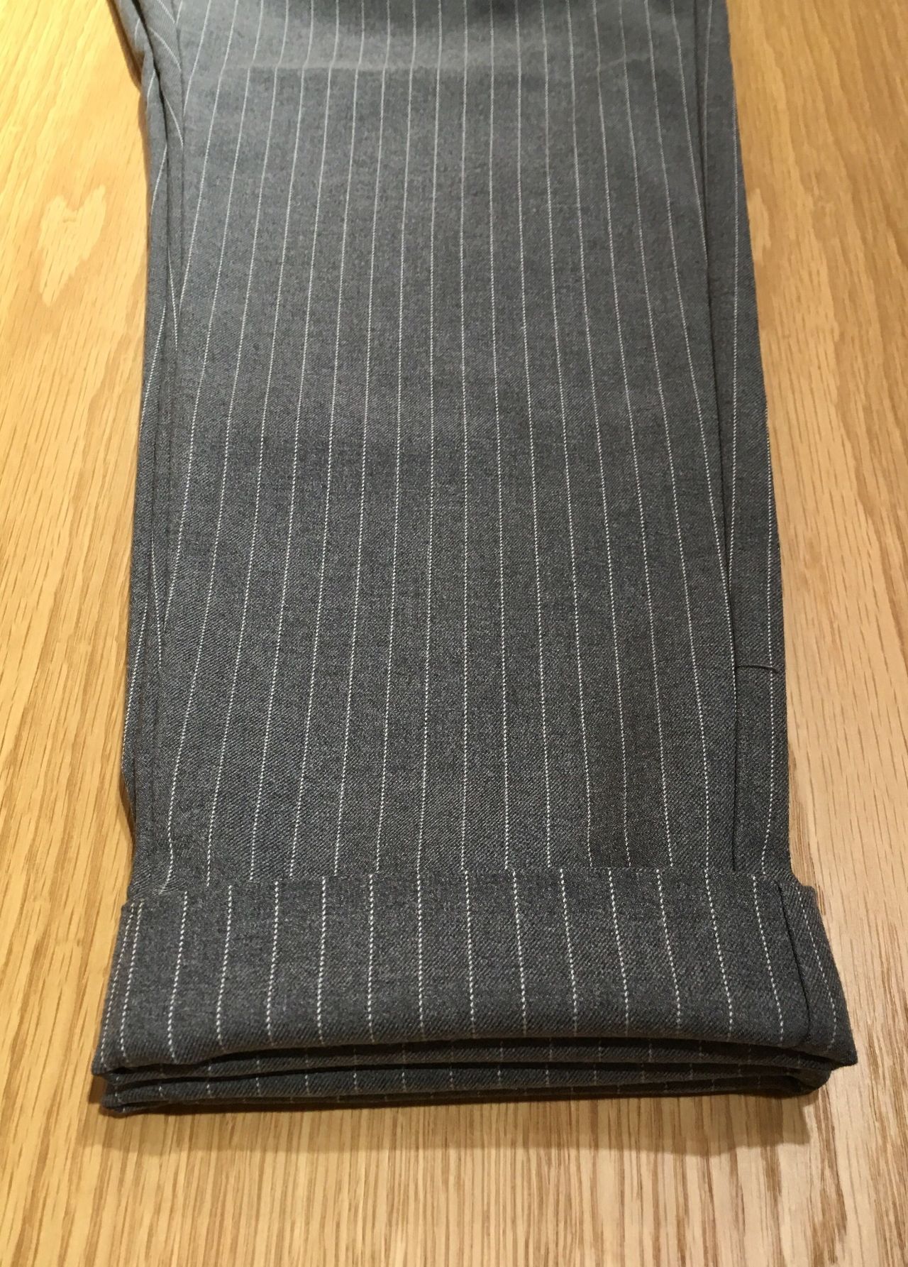 グレーストライプはウールスラックスと見紛うコシのあるTR(ポリエステル×レーヨン)素材。