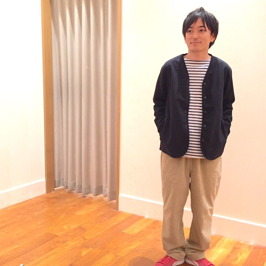 ボーダーTシャツにカーディガンを羽織ったオーソドックスなコーディネート。