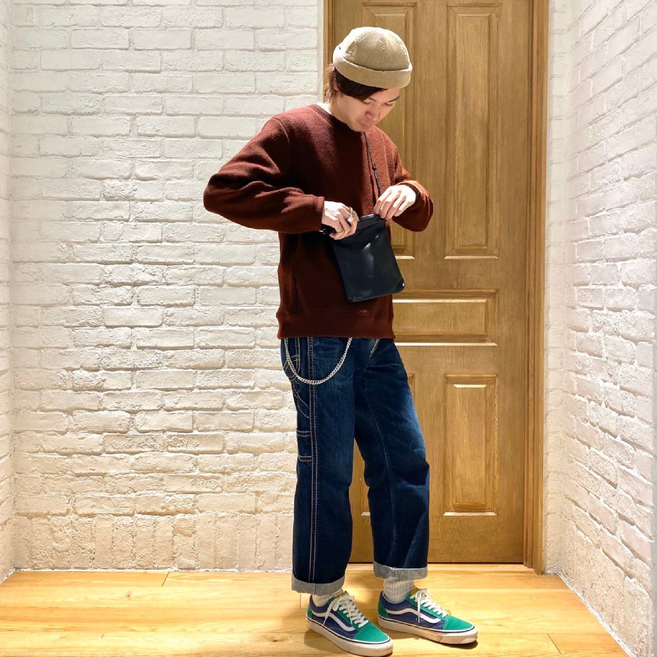 バーガンディーのニットソーの色味をきかせたコーデ。