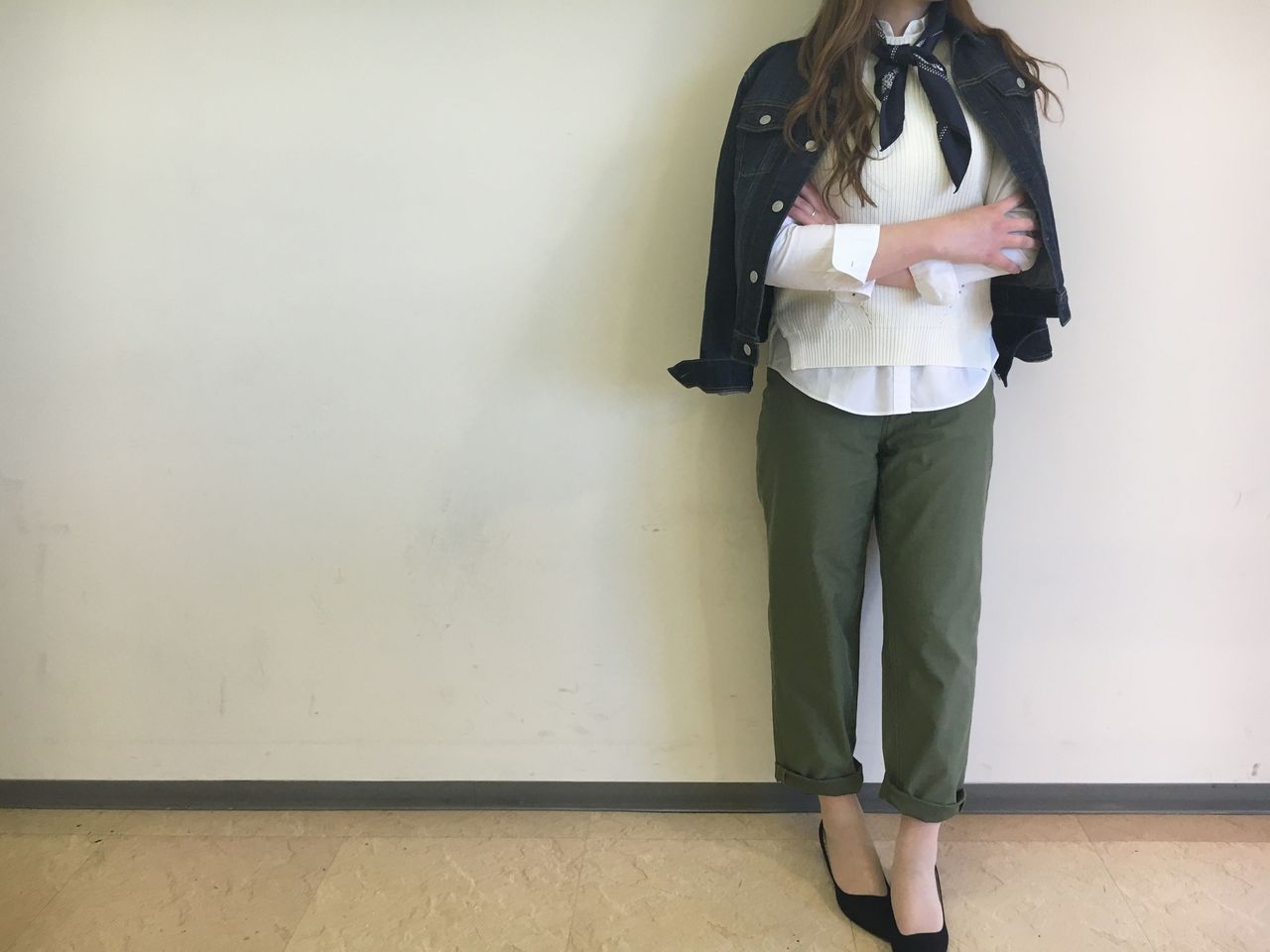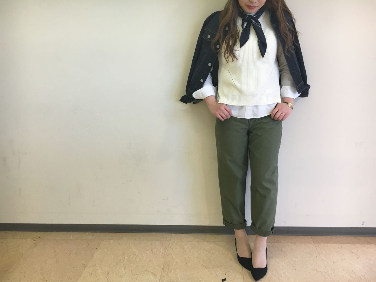 Gジャン肩がけ+パンプスで女性らしさを。