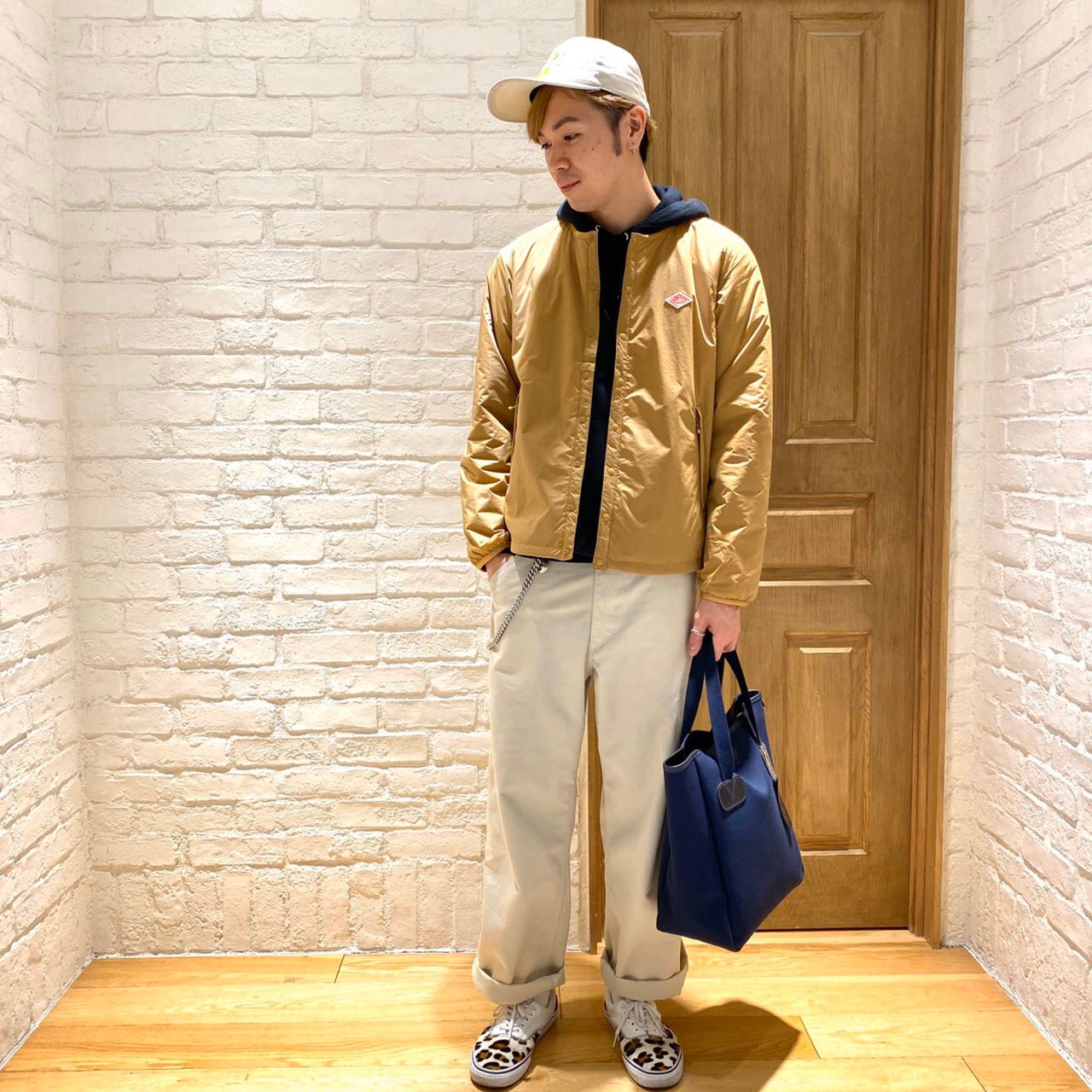 ネイビーで合わせたパーカー・トートバッグと、アクセントのスニーカーの柄で