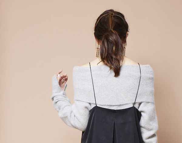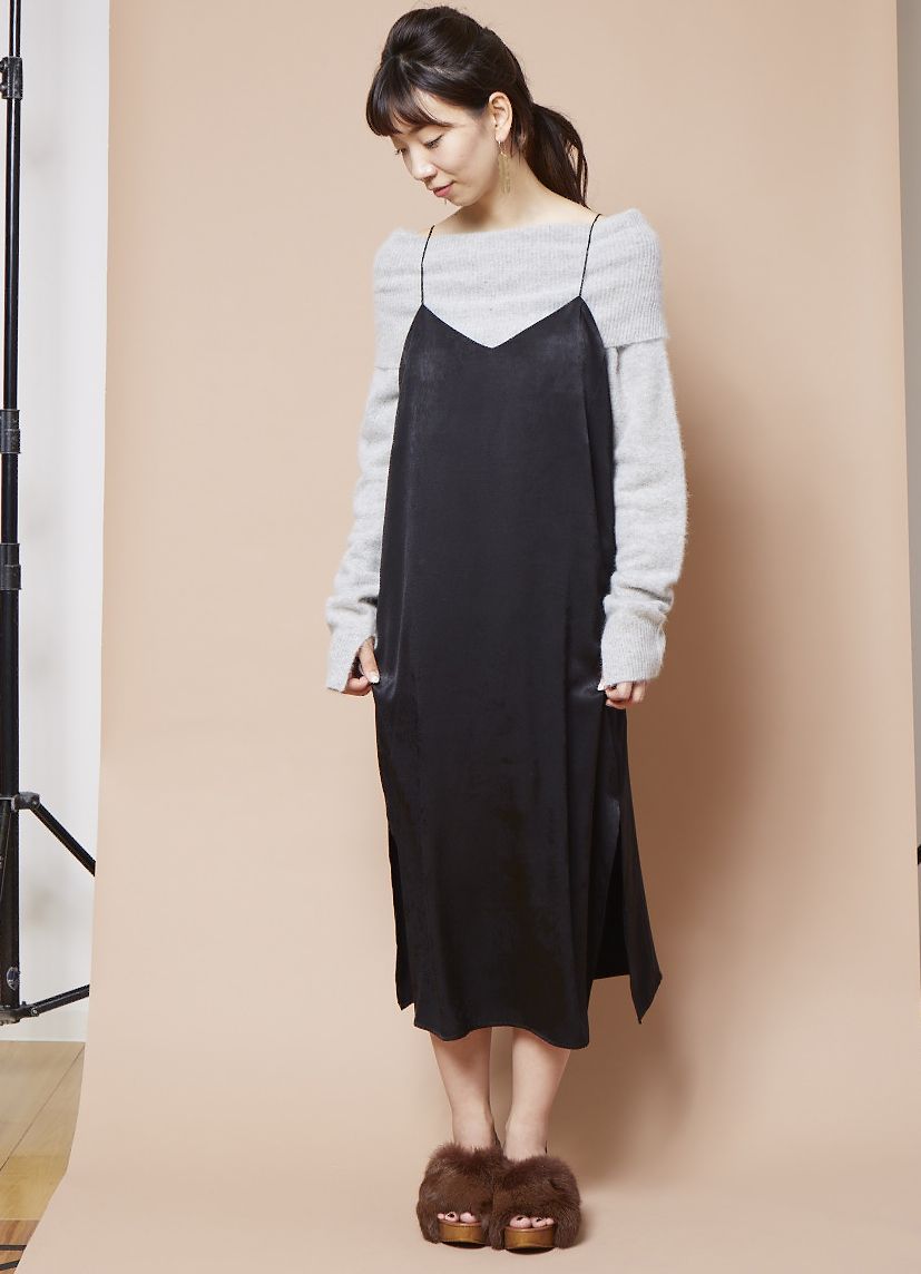 ふっくらした毛足が長めなオフショルダーのニットに、キャミワンピを重ねました。