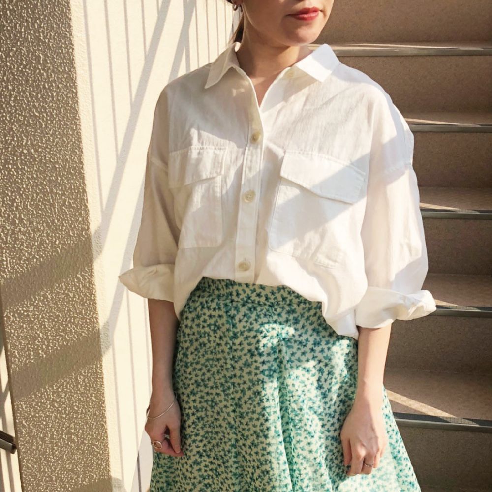 フェミニンなスカートには、ボタンを留めて、ウエストインにすると、