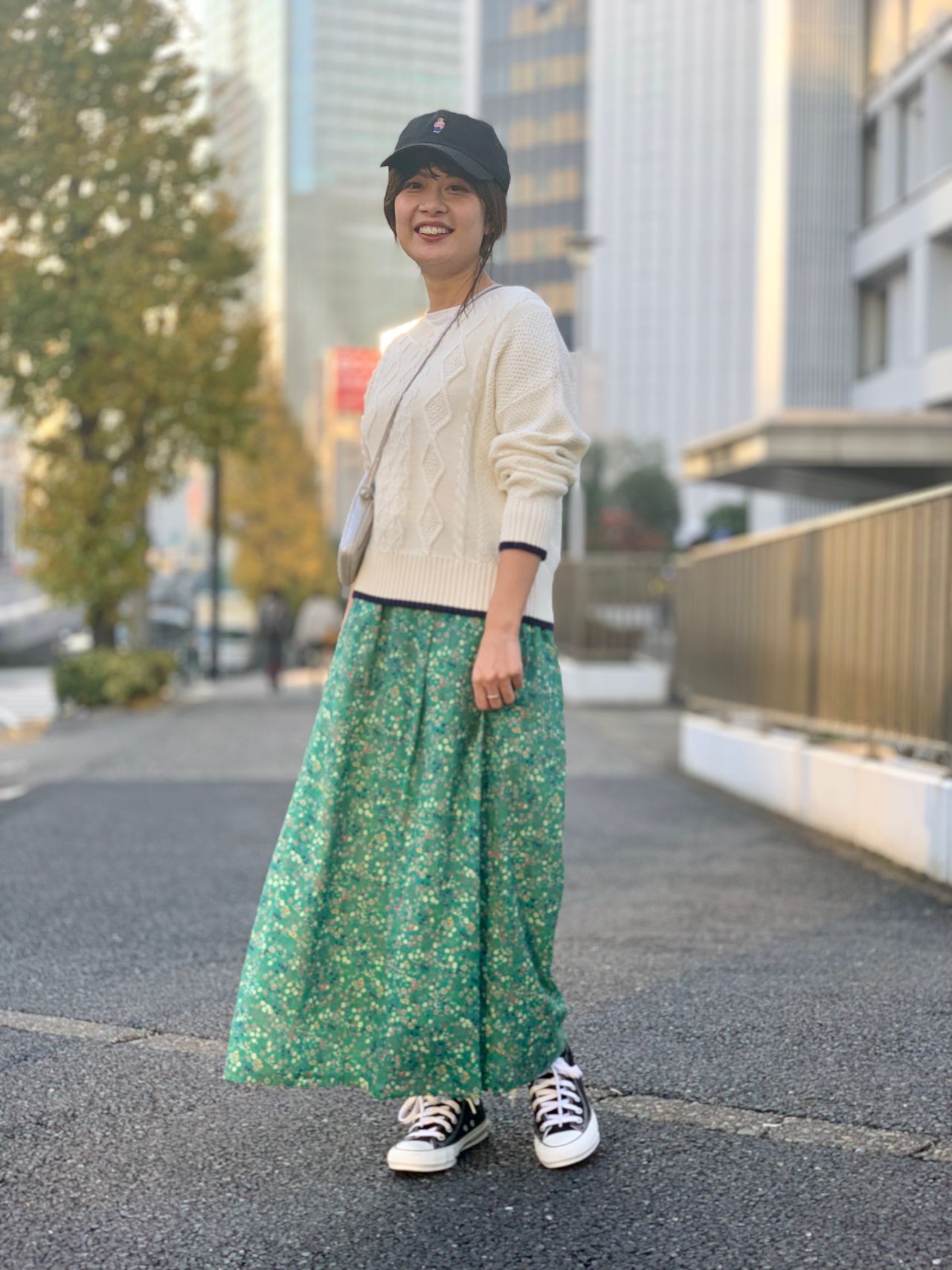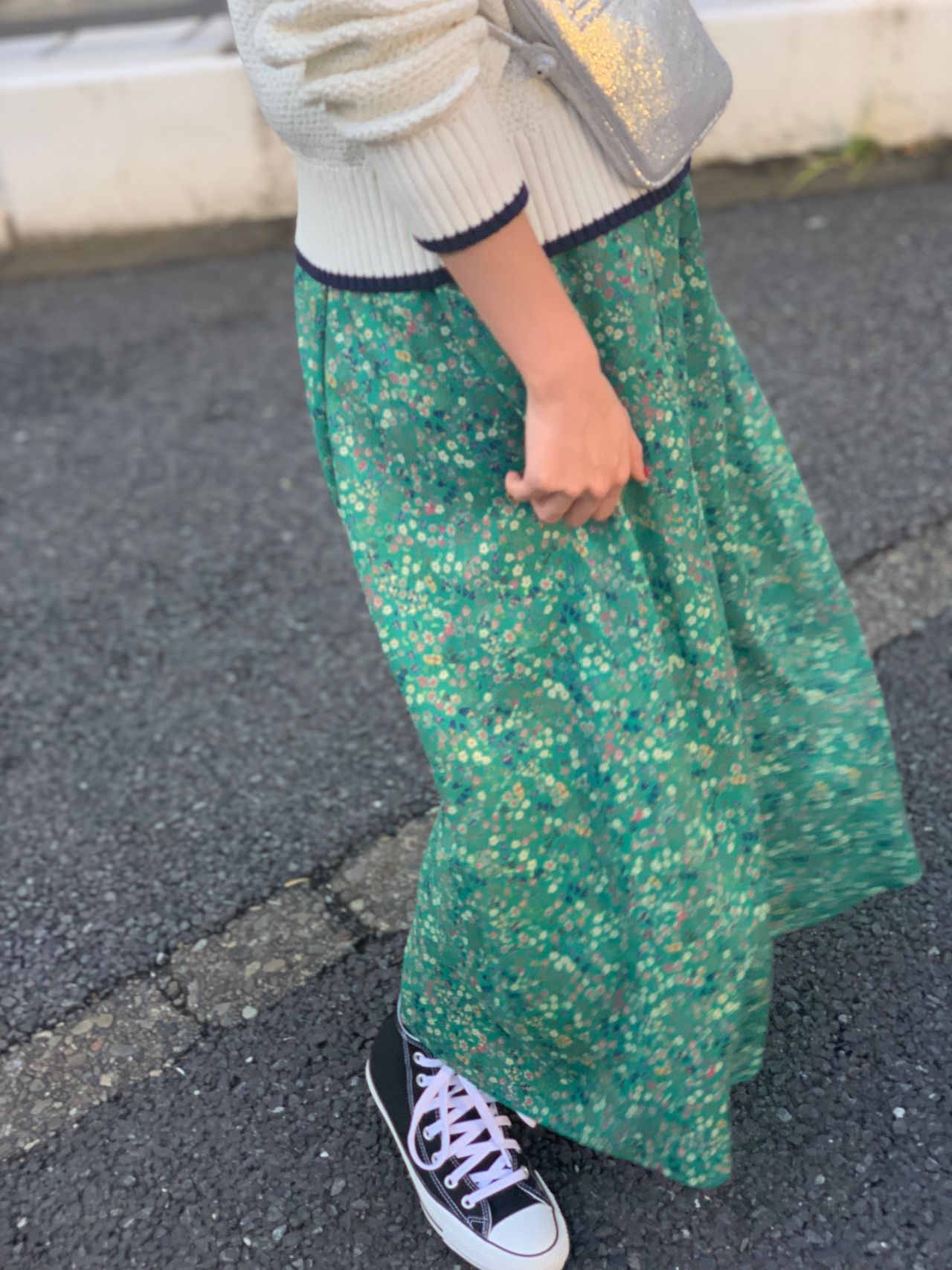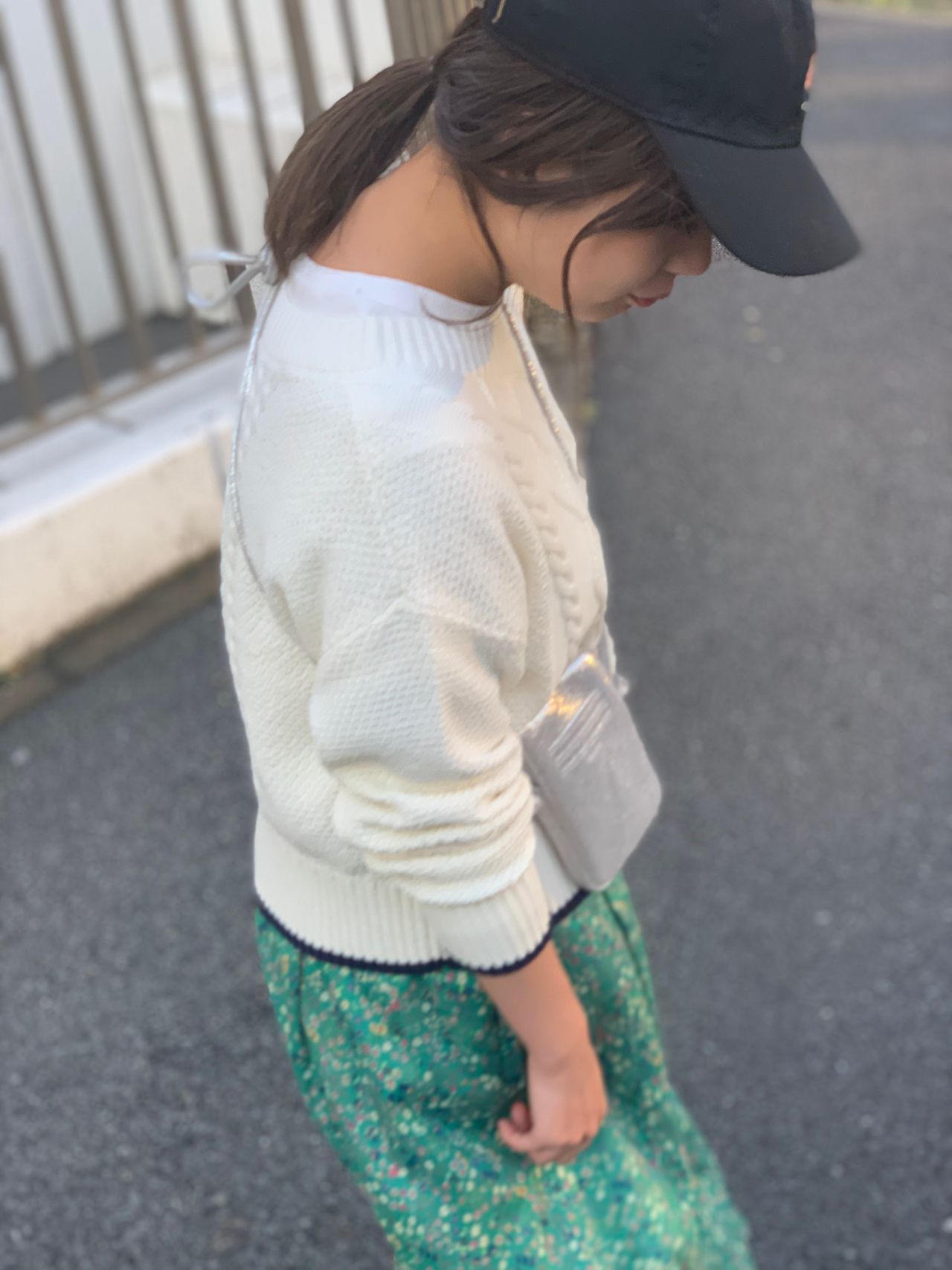 華やかなスカートを引き立てるために、トップスは真っ白な、ニットを選んで春らしくしてみました。