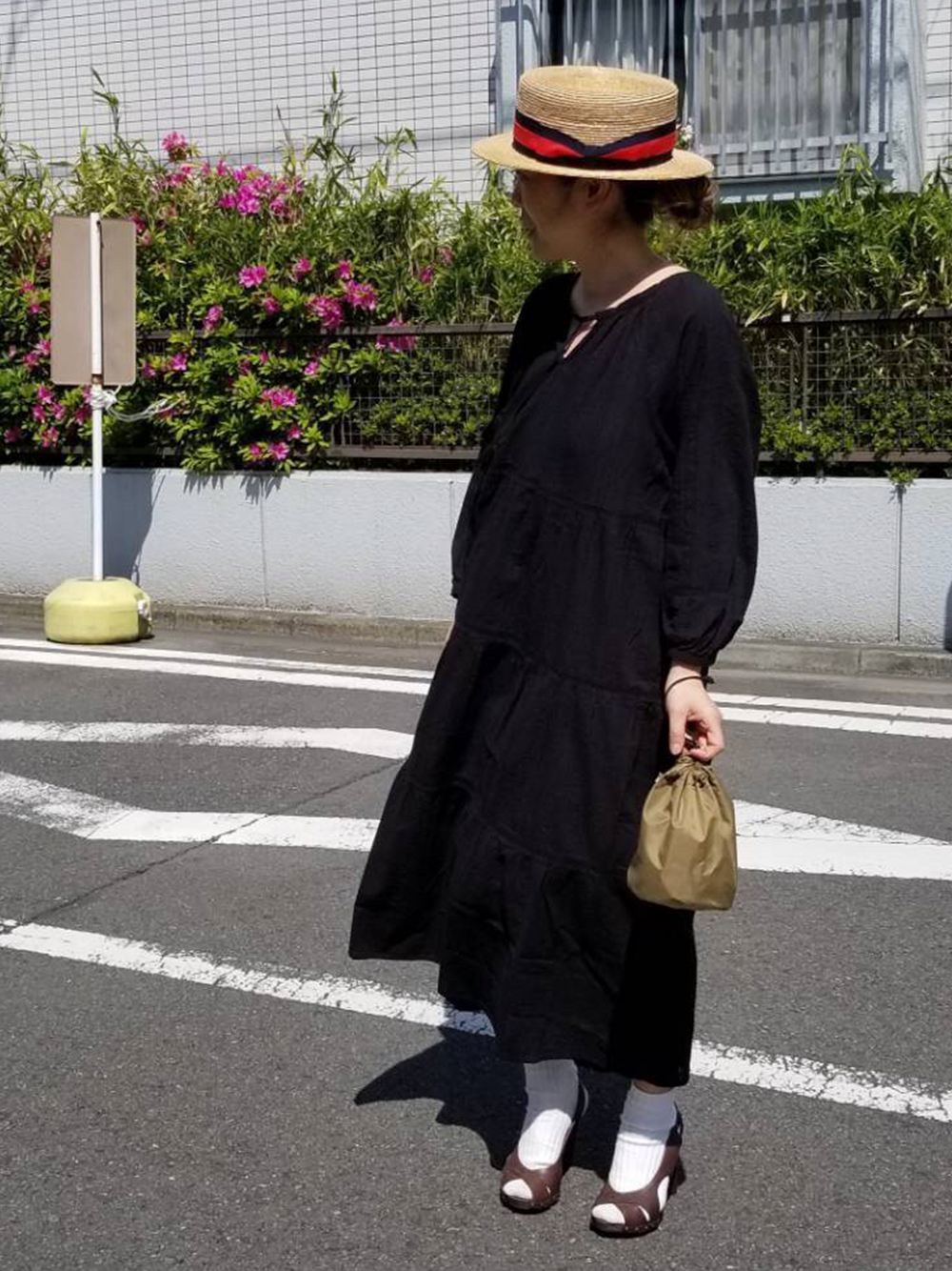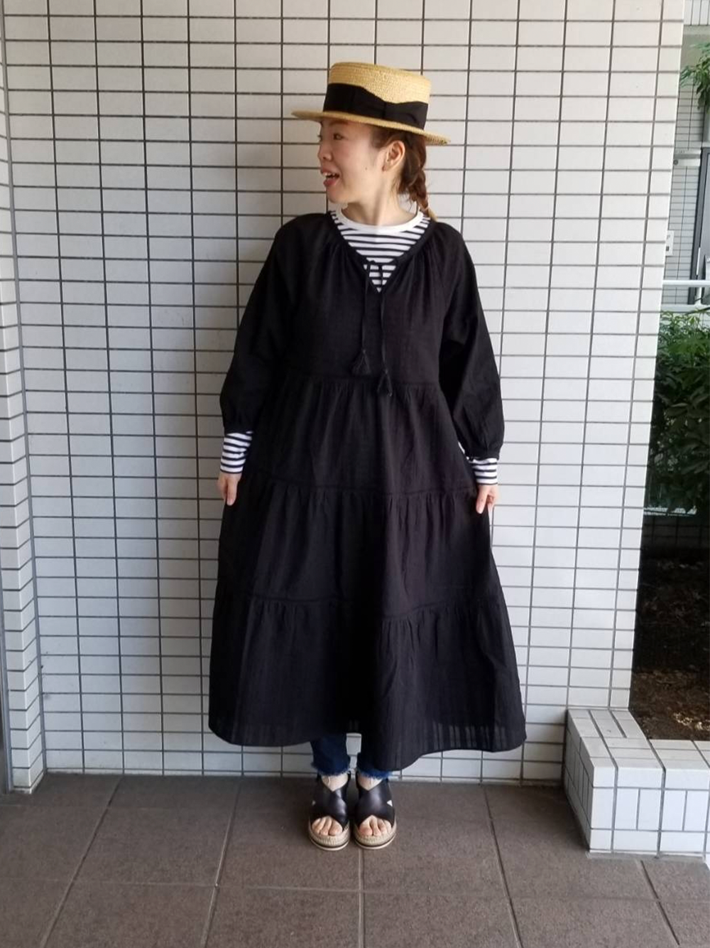 ボリュームのあるティアードワンピは、視線を上に上げてくれるカンカン帽との相性がぴったり。