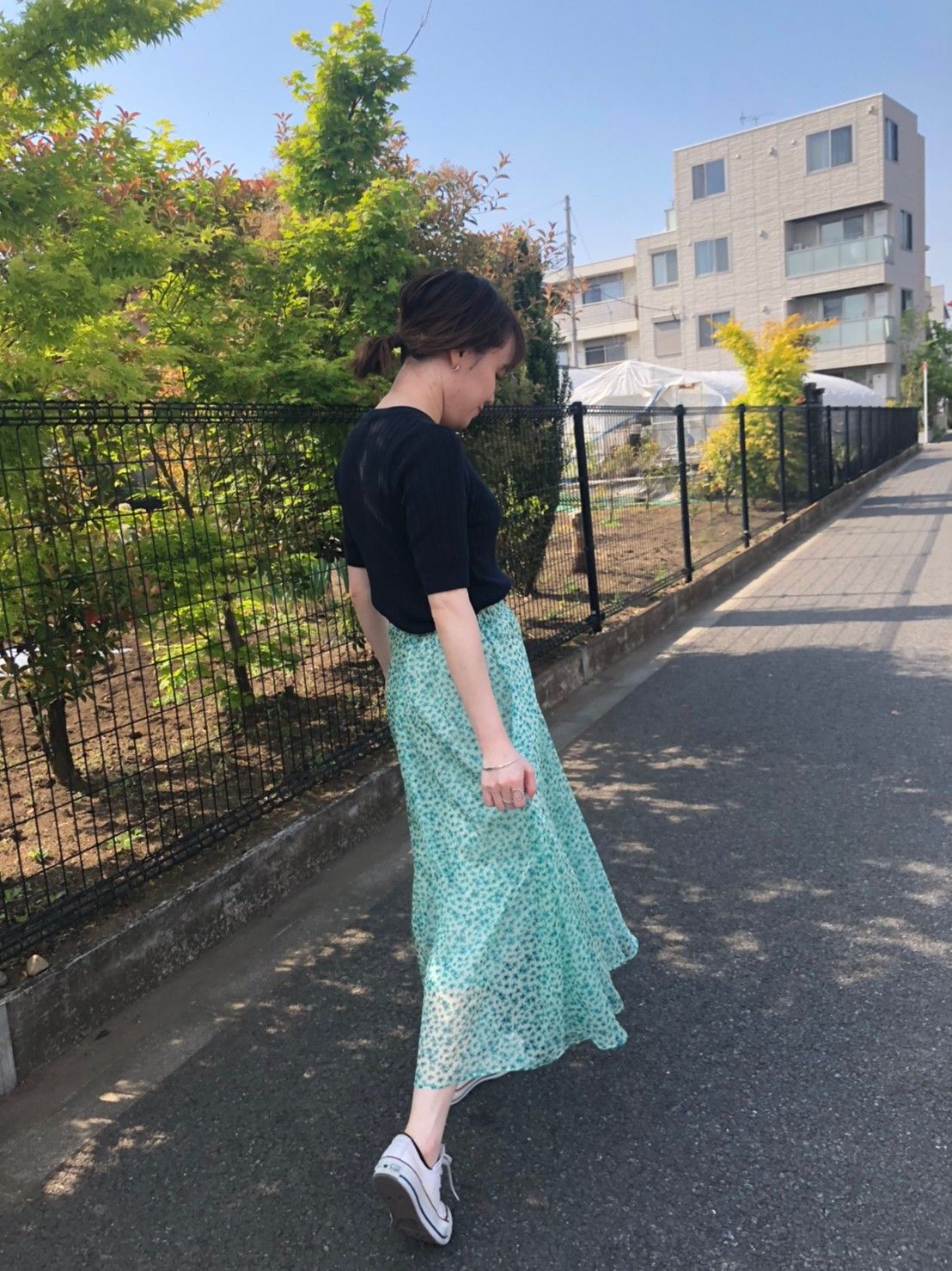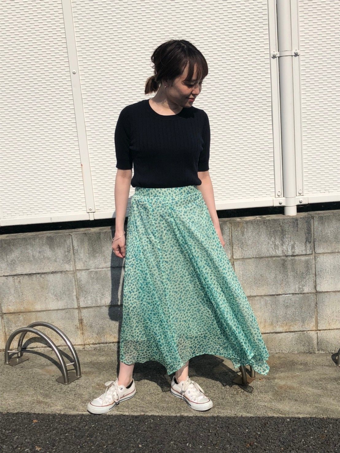 スカートの綺麗なグリーンを引き立てる、シンプルなコーディネイトです。