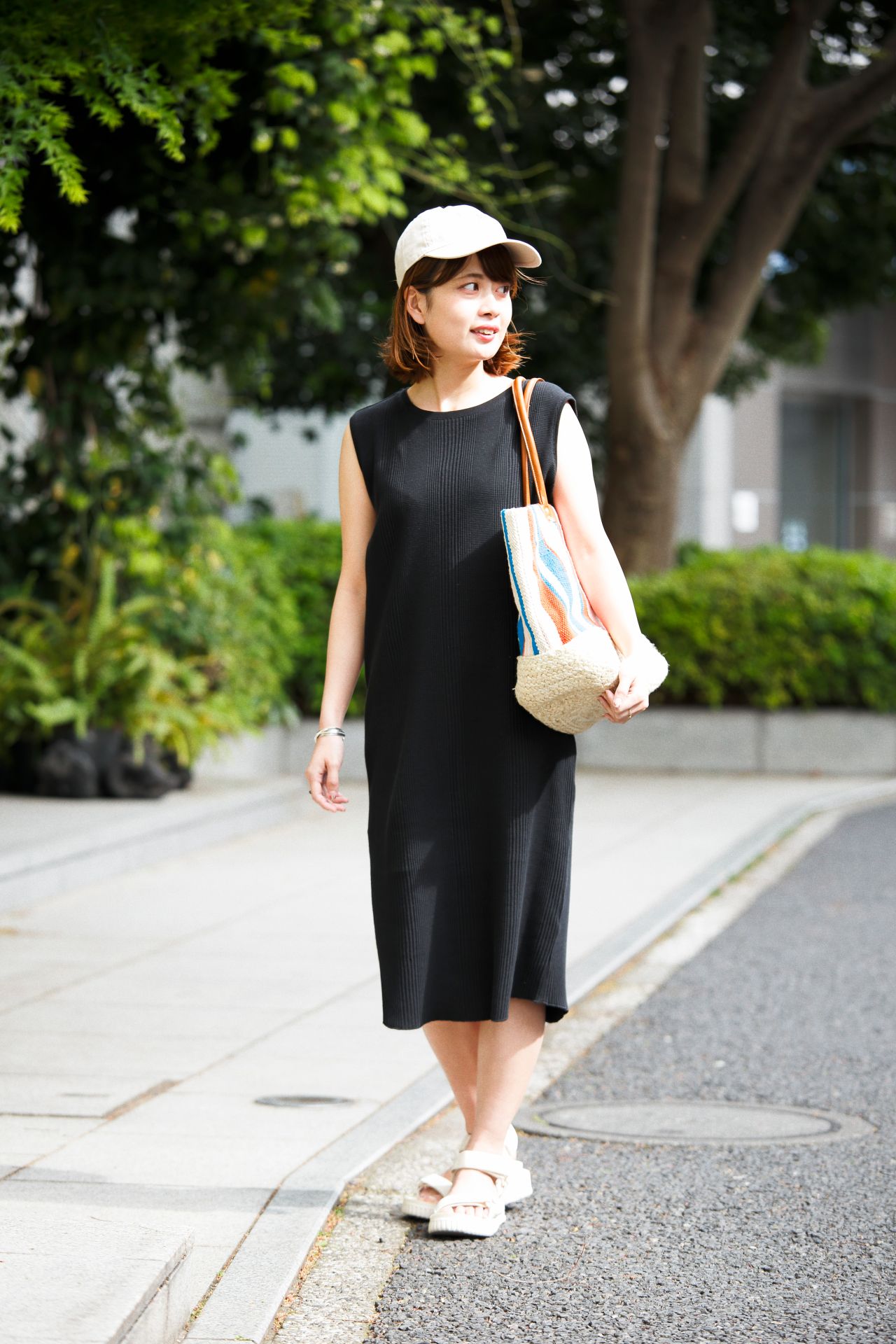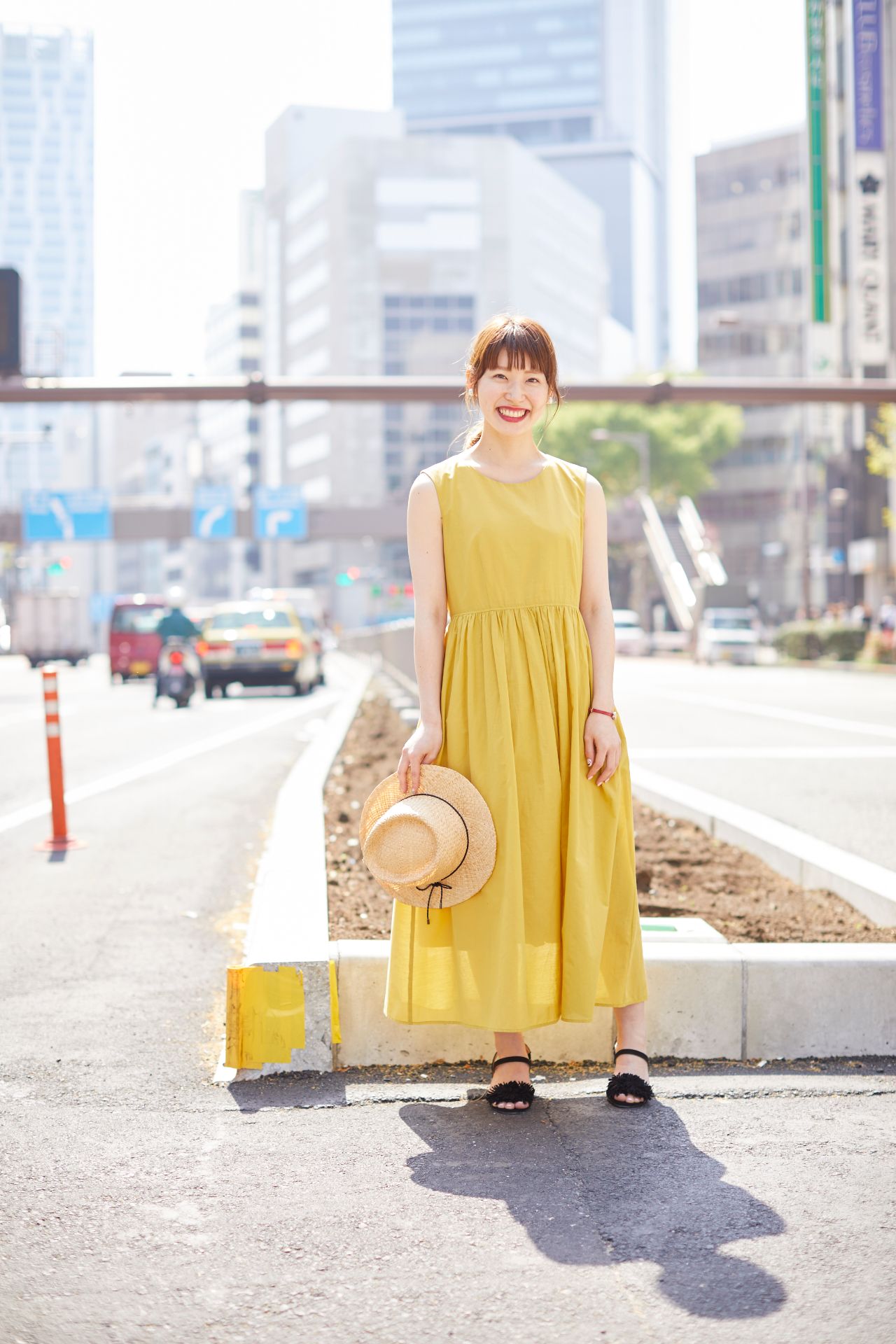 イエローが目を引く長め丈のワンピースは、透け感のある軽やかな素材を選んで涼しげに着こなして。麦わら帽子をプラスすれば、夏の日差しがぴったりなリゾート感あふれるコーディネートの完成です。足元はブラックのサンダルで絞めて、ラフになり過ぎないよう調整しているのもさりげないポイント。