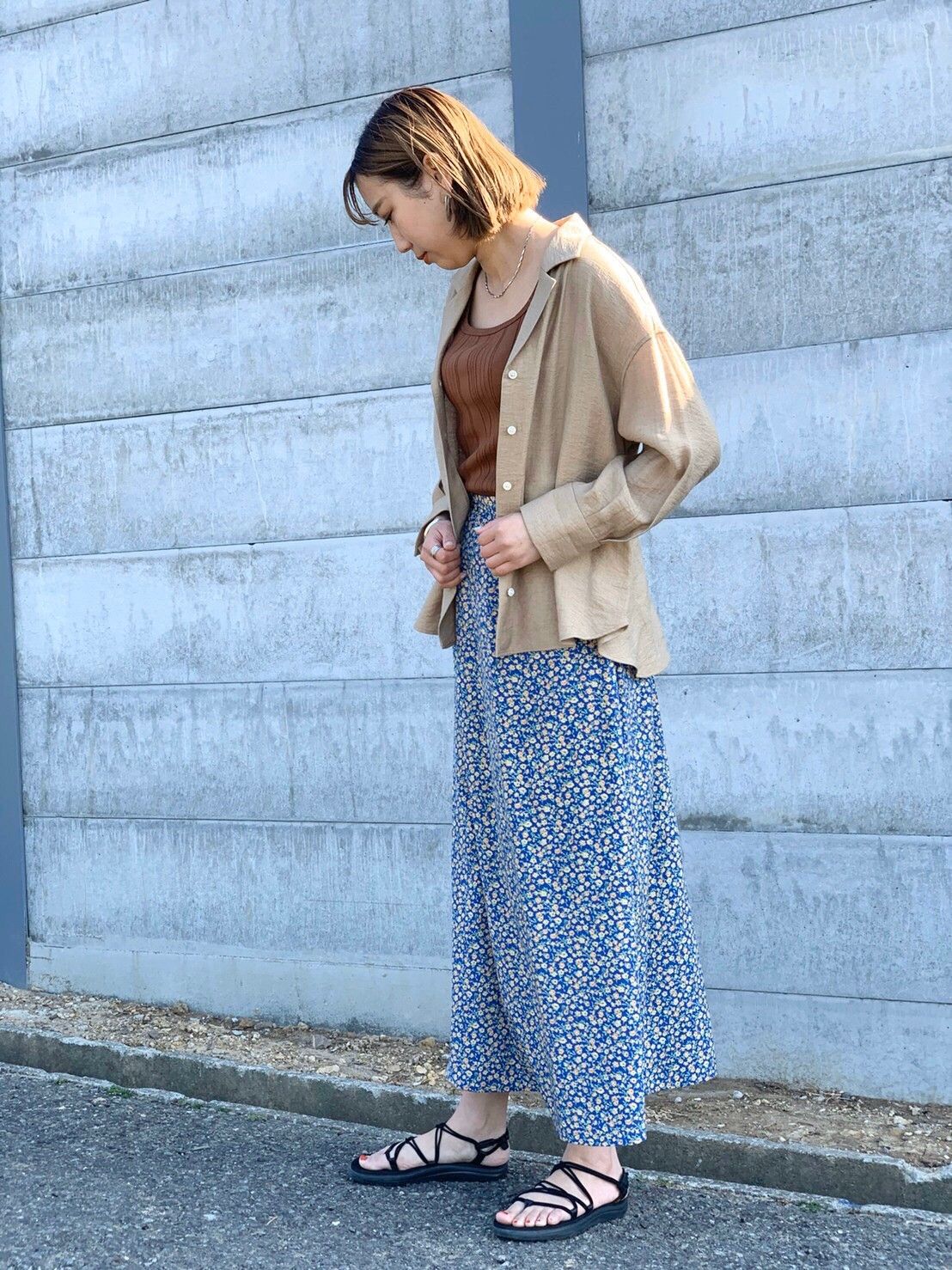 フェミニンな印象の小花柄のスカートは、あえてカジュアルに着るのが好きです。
