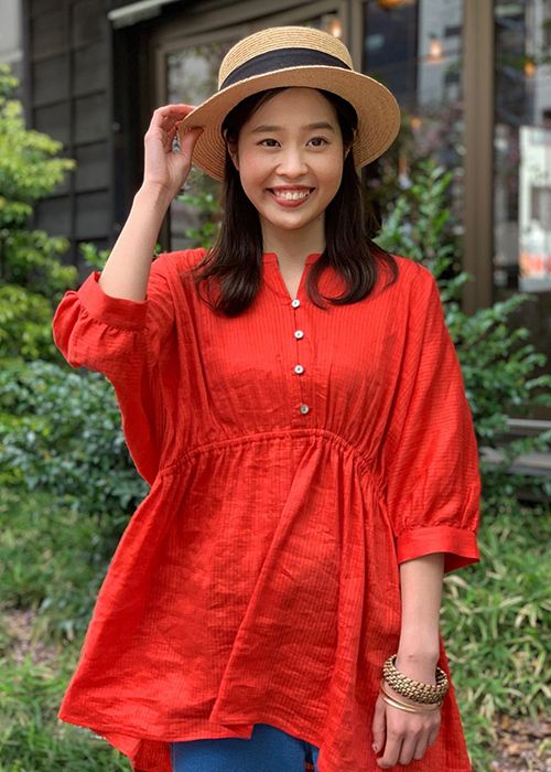 ボリュームたっぷりなブラウスはリネン素材の入った