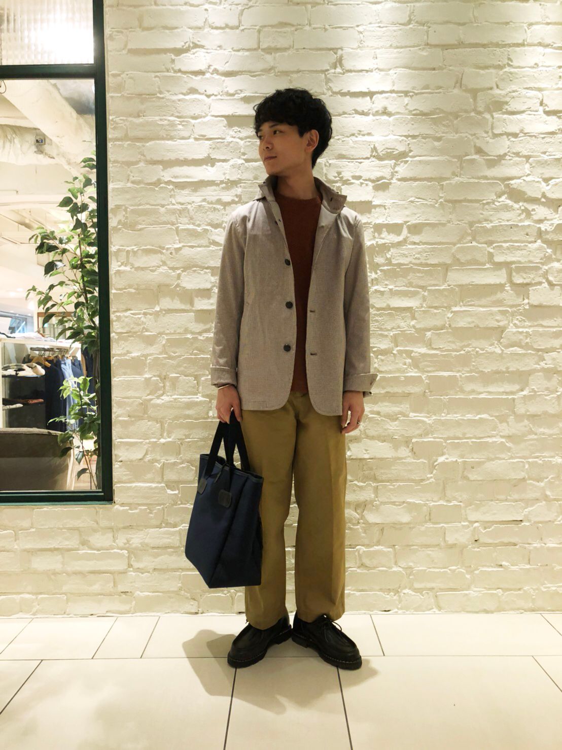 幅広いスタイルに馴染み、年齢層関係なく着こなすことができる懐の深さが、スタンドフードブルゾンの魅力ですね。お客さまも、シルエットの良さ、着心地、コーディネートのしやすさを気に入って購入いただくことが多いです。今回のコーディネートは、ガンクラブチェックのレトロな雰囲気を活かしながら、全体的にブラウン系でまとめています。