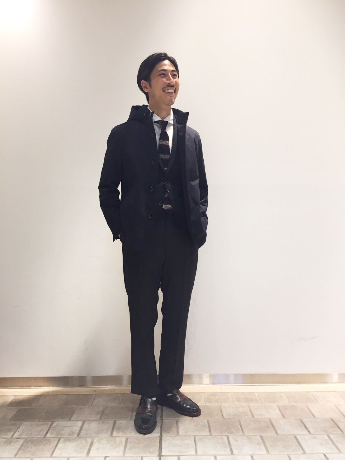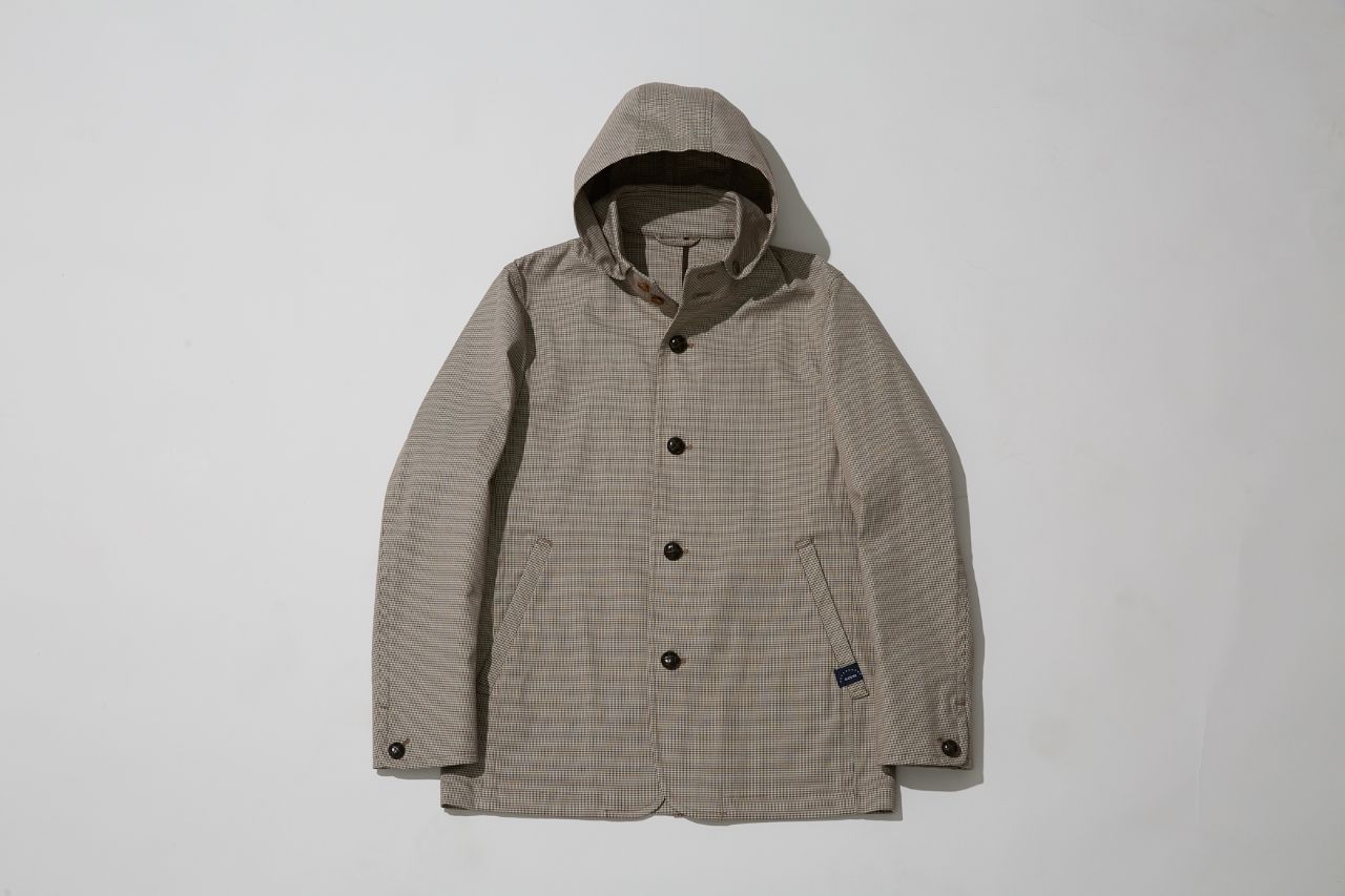 スタンドフードブルゾンは、ON/OFF兼用でどんなスタイルにもマッチする。そんな使い勝手抜群な点が魅力ですね。ジャケパンスタイルでも重くなりすぎないように、今日はニットタイとローファーを使ってカジュアル感を演出してみました。このスタンドカラーは襟立ちがいいので上品に見えるんです。しかも、フードが付いているのでカジュアルにも使える。そのバランスが絶妙なんです。ネイビーやベージュの定番色も捨てがたいですが、 今年は新たに追加されたチェック柄を選んで、トレンドを取り入れてみるのもおすすめですよ。