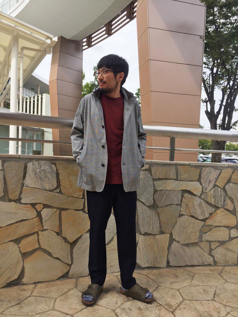グレンチェックで清潔感を出しつつも、ラクに出かけられるコーディネートを目指しました。スタンドフードブルゾンはシーズンレスで使え、気温やコーディネートなど、何かしら困ったときに一枚羽織るだけでスタイルが完成します。しかも、インナーやボトムを選ばないので本当に便利なんです。そこはお客さまも理解されていて、幅広い年齢層の方から支持されています。なお、今年らしさを出すならば、ロンTにワイドパンツ、そしてパーカーの代用としてこのスタンドフードブルゾンを羽織ってみる。そんな風にストリートっぽく着こなすのもおすすめです。