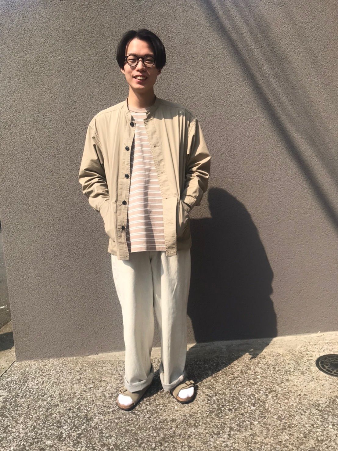 ボーダーのTシャツにさらっとバンドカラーシャツを羽織ったワンマイルコーデに仕上げました。