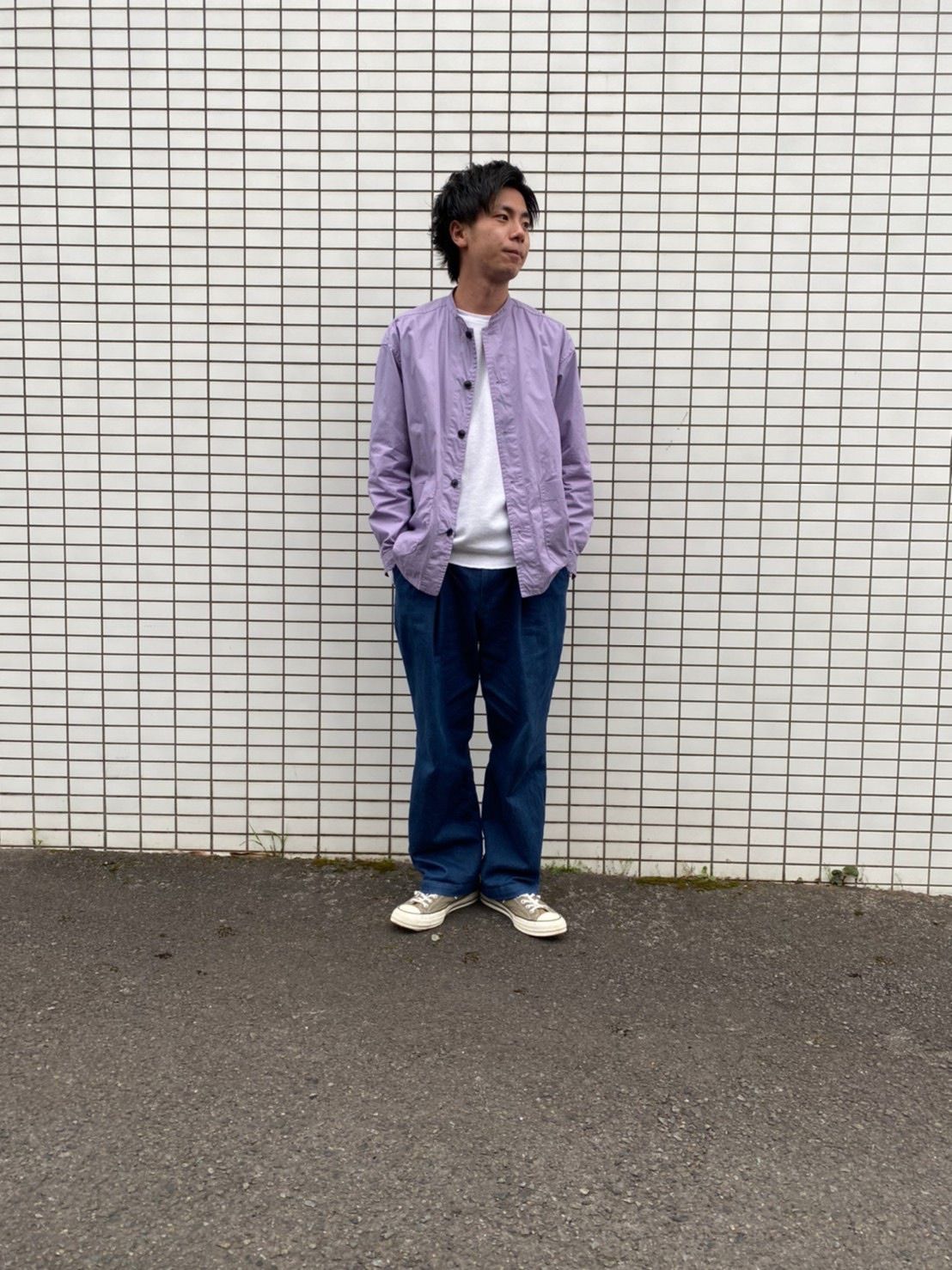 パープルのバンドカラーシャツに、デニムとコンバースを合わせて
