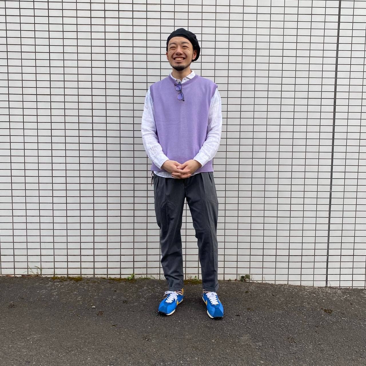 清潔感を出しつつもベレー帽と明るい色のローカットスニーカーで