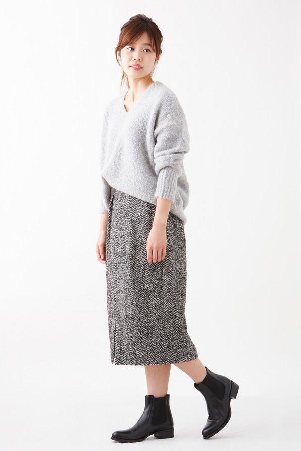 すっきりとしたチャコールグレーのタイトスカートに合わせれば、