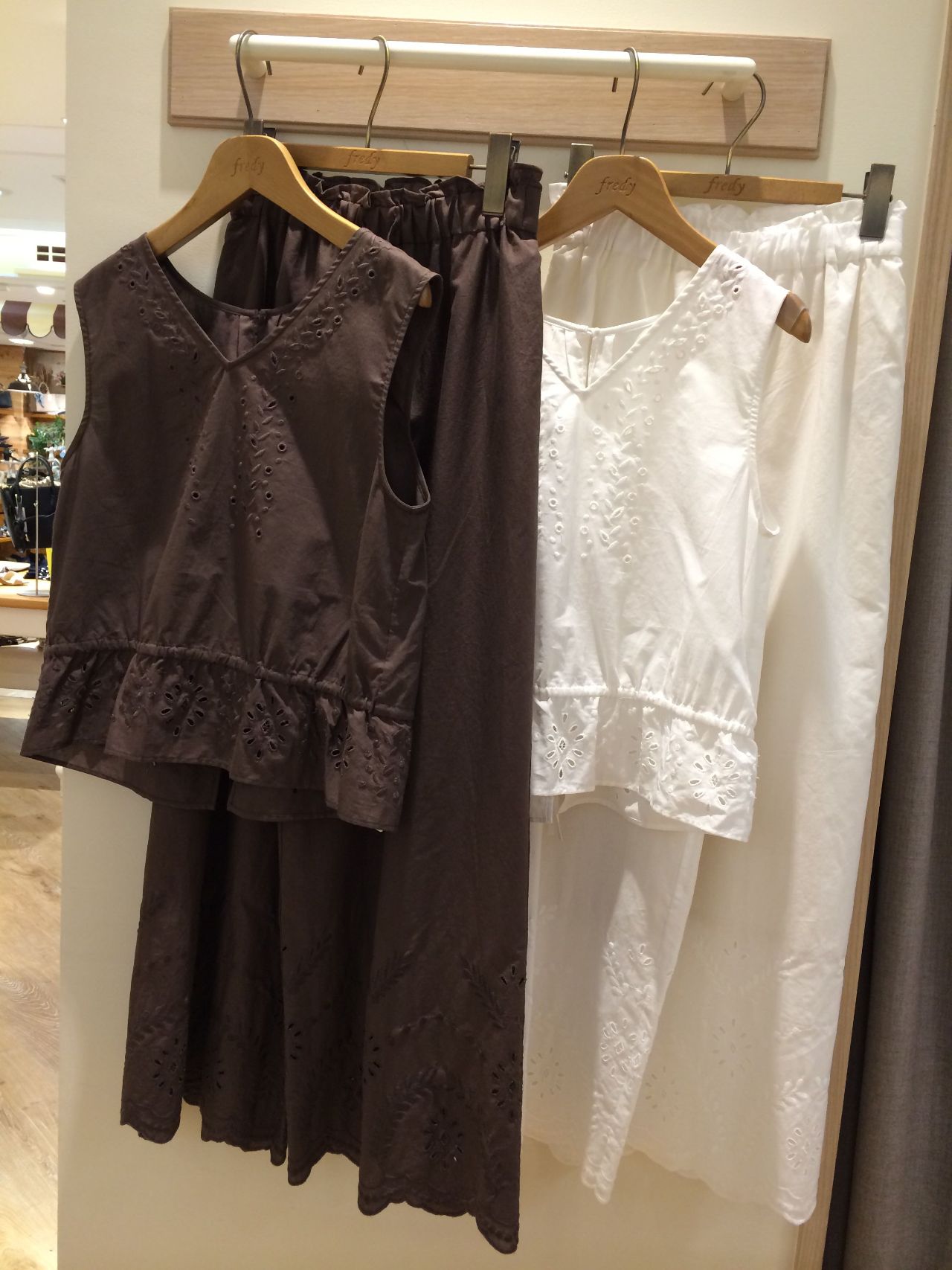 色味は、ホワイト•ブラウン•ブラックの3色で、サイズは上下ともに36(S)、38(M)のご用意でございます!